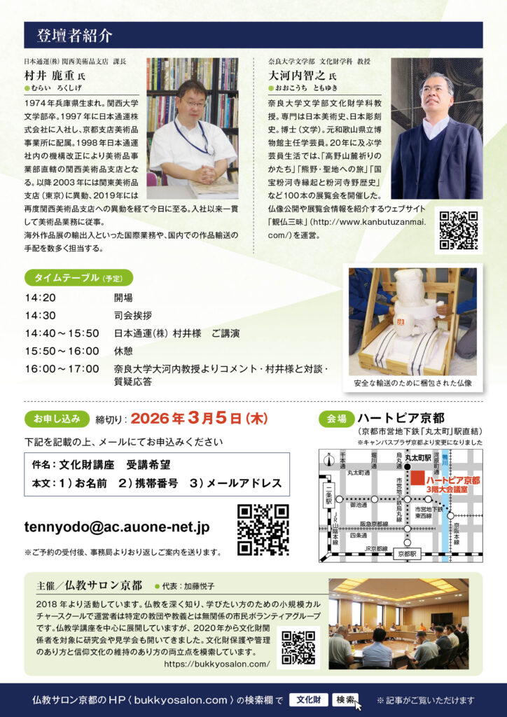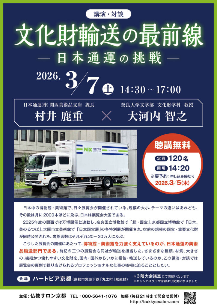 講演・対談 「文化財輸送の最前線‐日本通運の挑戦」リーフレット 2025 12/20 「文化財と信仰」研究会 2025年11月23日2025年12月20日 「文化財と信仰」研究会 国宝 大河内智之 指定文化財 文化財 文化財輸送 日本通運 村井鹿重 美術品 重要文化財 よかったらシェアしてね! URLをコピーしました! 奈良大学文学部文化財学科教授 大河内智之(おおこうち ともゆき)氏 この記事を書いた人 悦子加藤 関連記事 「文化財と信仰」研究会 掲載紙紹介 2024年7月6日 「なら歴史芸術文化村」見学ツアー 2024年7月5日 第4回「文化財と信仰」研究会 2023年7月19日 第3回「文化財と信仰」研究会 2022年9月16日(金)13:30~17:00 2022年6月23日 第2回「文化財と信仰」研究会2020.9.15 2021年1月5日 第1回「文化財と信仰」研究会 2020.1.25 2020年3月7日